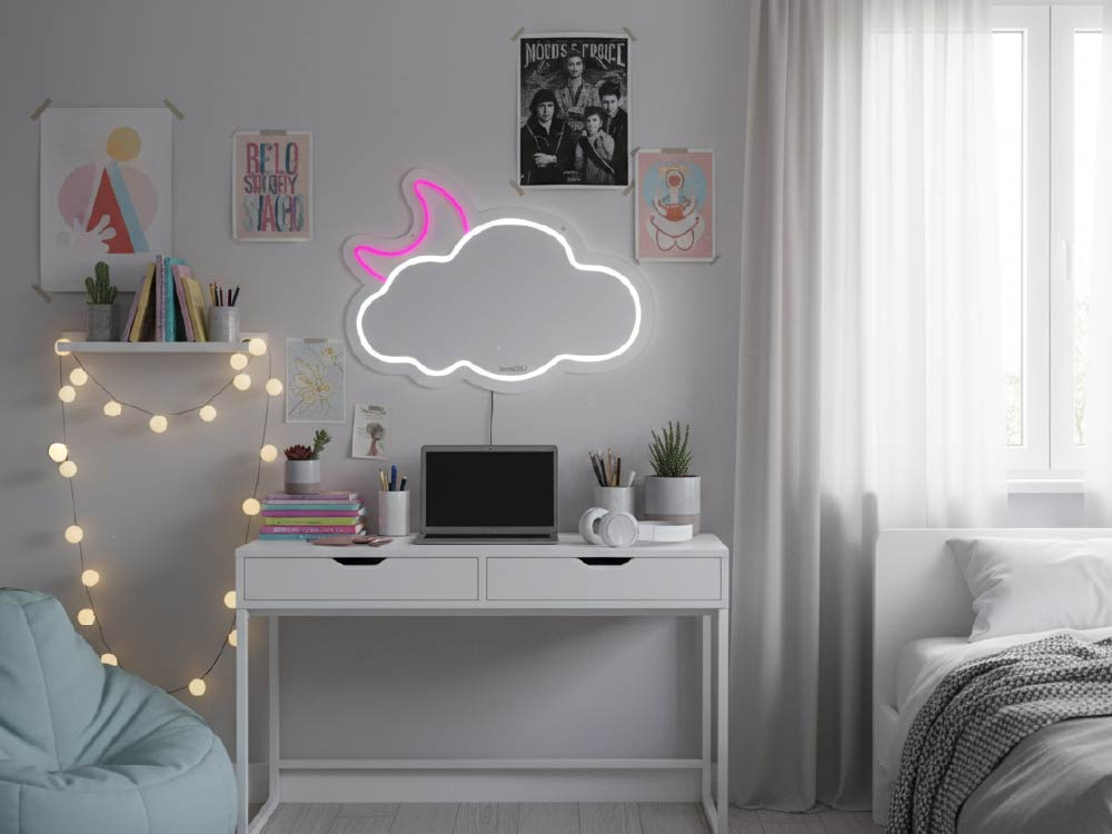 GIOperfect LED vibes Cloud è un raffinato specchio al neon che aggiunge un tocco di magia e una luce soffusa a qualsiasi spazio. La sua forma di nuvola con luna crea un’atmosfera serena e rilassante — perfetta per camere da letto, spazi per adolescenti o l’angolo toeletta di una piccola principessa.